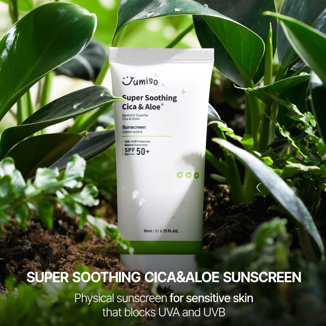 Jumiso Super Soothing Cica & Aloe Sunscreen SPF50+ PA++++ is a skin care product designed to provide sun protection and hydration to the skin. The sunscreen has a high SPF of 50+ and PA++++ rating, offering broad-spectrum protection against UVA and UVB rays. The product contains cica, also known as centella asiatica, which is known for its soothing and calming properties, and aloe vera, a natural ingredient known for its hydration benefits. The formula is lightweight and absorbs quickly into the skin, making it suitable for use under makeup or as a daily moisturizer. The product comes in a convenient tube packaging.